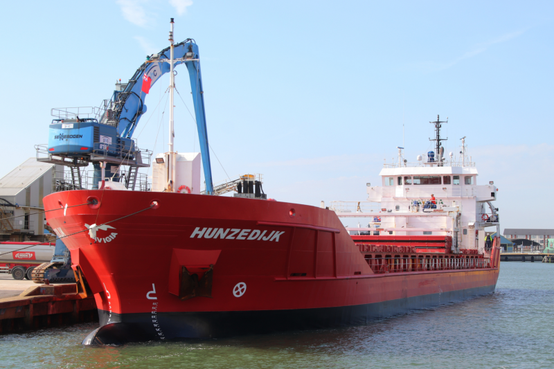Key Dimensions for Hunzedijk … Gross Tonnage = 2,984 … Length = 90m … Beam = 14m … Hold Dimensions = 62.3m x 11.7m x 8.1m … Hold Capacity = 5,820 cu.m … Speed = 12 knots … in service since 2011.